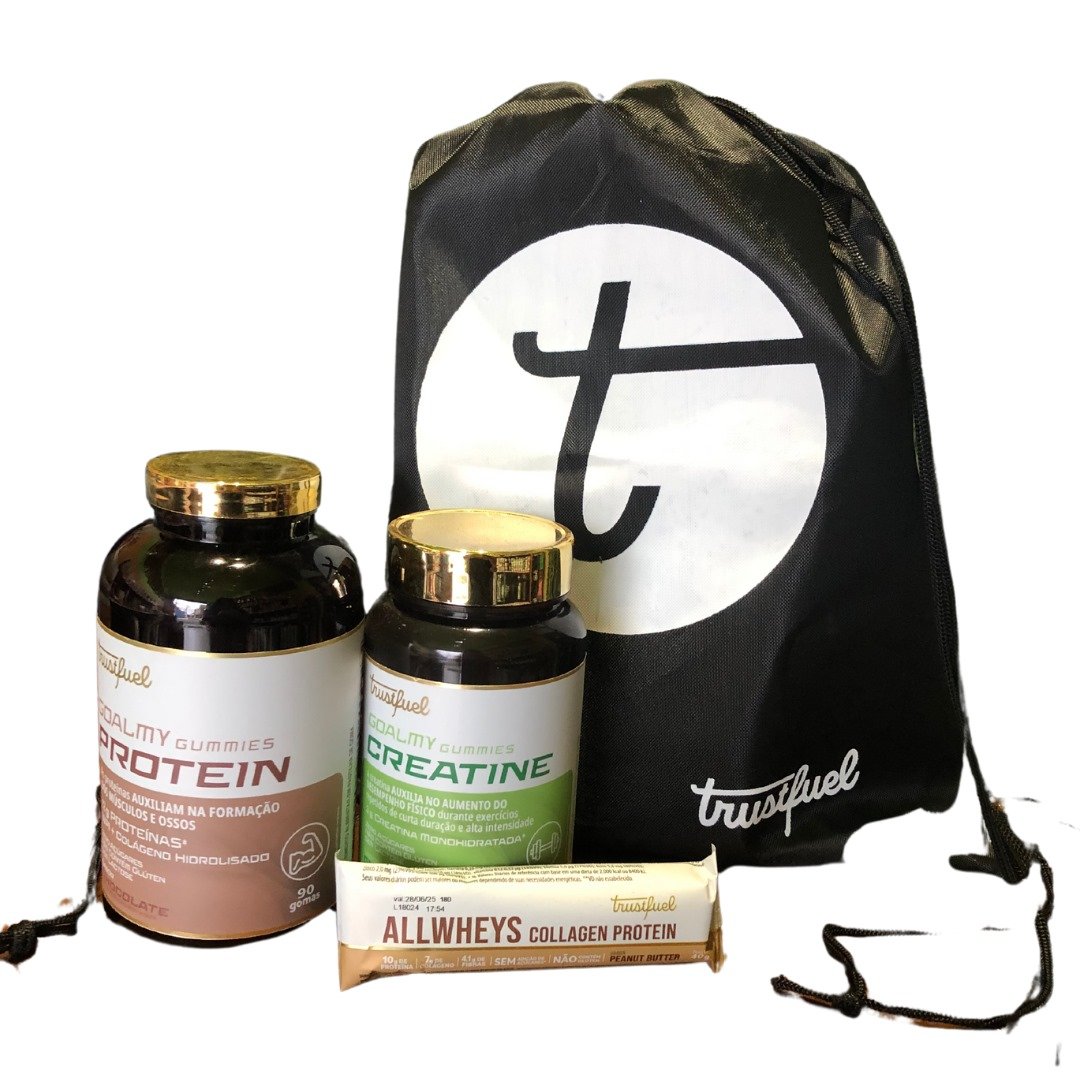 Kit Trustfuel Gummies Protein, Gummies Creatine, Barra Allwheys + Sacochila
